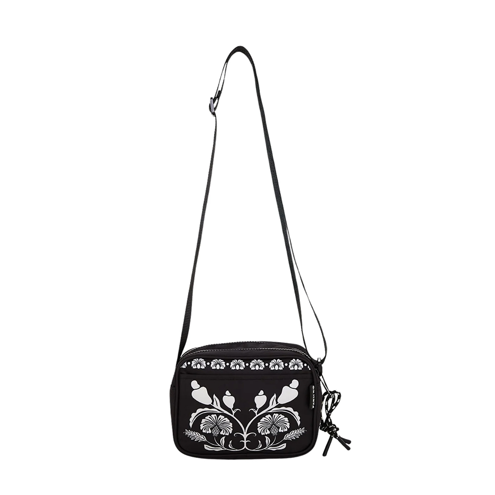 Bolsa casual estruturada com duas aberturas principais em fechos de zíper. alça com regulagem para uso transversal.