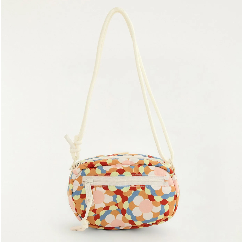 Bolsinha com abertura principal e bolso frontal com fechos de zíper. Acompanha alça de corda ajustável, para usar a bolsa transversal ou como baguete. na parte de trás da bolsa também se encontra dois passadores que possibilitam o uso como pochete presa em cinto.