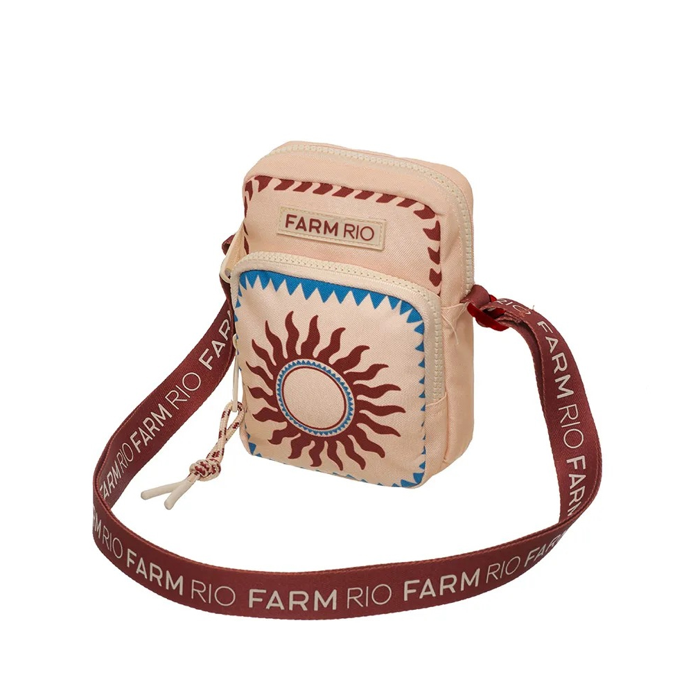 A Bolsa Farm da Gema Lenço Solar possui tamanho pequeno, formato retangular, compartimento interno com forro, bolso posterior, tag da marca aplicada em borracha na parte frontal, mix de estampas em cores contrastantes, alça de ombro média em gorgurão com regulagem e nome da marca estampado em tom contrastante, bolso frontal com fechamento por zíper com puxador e fechamento superior por zíper.