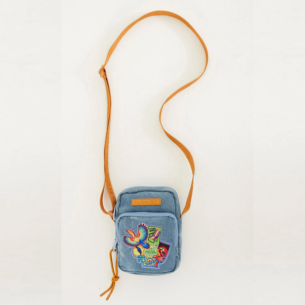 Bolsa da gema patch rio jeans. bolsinha transversal shoulder bag, com alça regulável. abertura principal e bolso frontal com fechos de zíper. o que não se veste, se vive. chegou farm etc, a marca de lifestyle da farm rio.