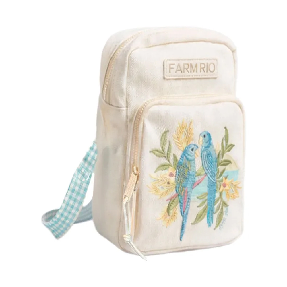 Bolsa Farm da GemaRio Antigo. Bolsinha transversal shoulder bag, com alça regulável. abertura principal e bolso frontal com fechos de zíper. Confeccionada em poliéster na cor Off White possui bordado com autêntico borogodó da Farm.