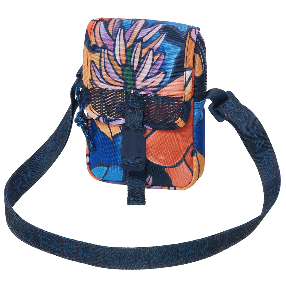 A Bolsa Farm Fervo Banana Flora possui tamanho pequeno, formato retangular, mix de estampas em cor contrastante, compartimento interno amplo, aba frontal sobreposta com recorte em mesh, tiras médias de gorgurão aplicadas com nome da marca na parte frontal, bolso frontal, bolso posterior, alça longa em gorgurão com nome da marca e regulável, base reta, forro têxtil e fechamento superior por zíper e encaixe frontal.