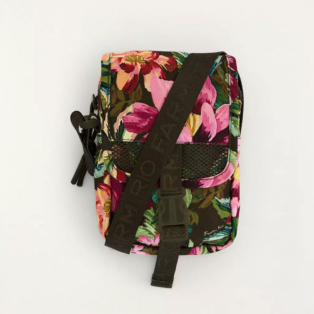 A Bolsa Farm Fervo Painted Flowers possui tamanho pequeno, formato retangular, mix de estampas em cor contrastante, compartimento interno amplo, aba frontal sobreposta com recorte em mesh, tiras médias de gorgurão aplicadas com nome da marca na parte frontal, bolso frontal, bolso posterior, alça longa em gorgurão com nome da marca e regulável, base reta, forro têxtil e fechamento superior por zíper e encaixe frontal.
