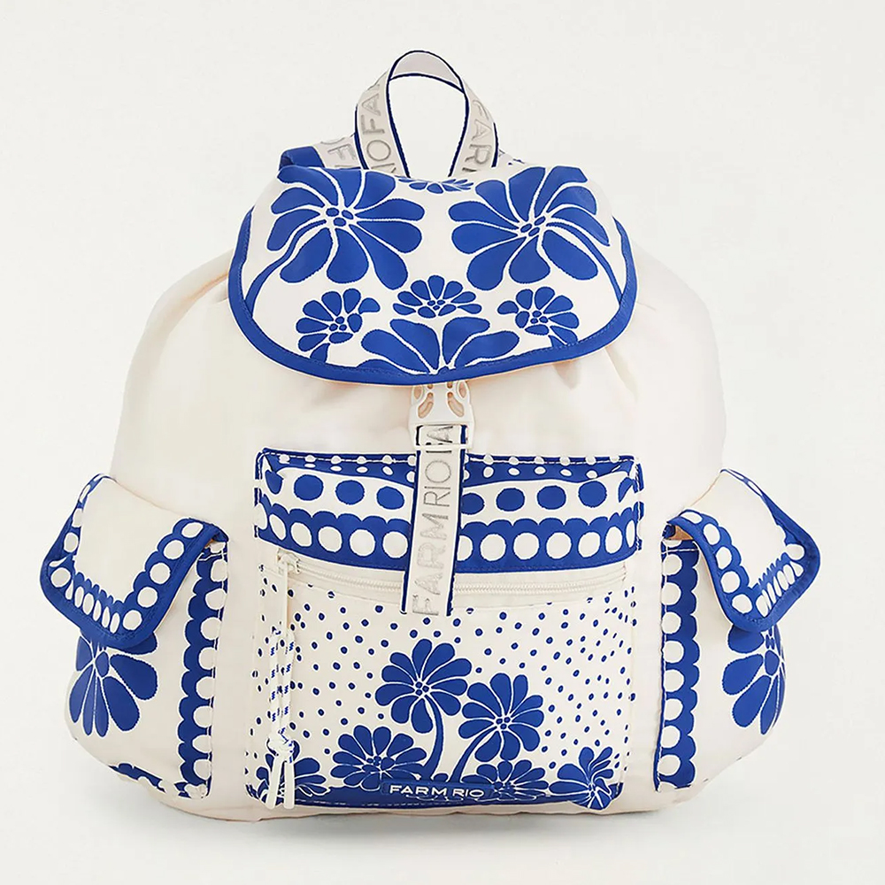 A Bolsa Farm Pipoca Palermo possui fechamento superior por cordão de ajuste e fivela de encaixe, bolso frontal com fechamento por zíper, dois bolsos laterais, alca de mão e duas alças de combro com regulagem.