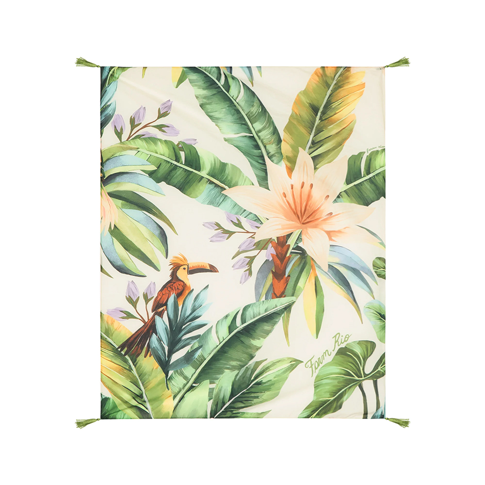 A Canga Farm Praiana Tropicália é confeccionada em tecido sem elastecidade. A peça possui tamanho grande, formato retangular, mix de estampas em cores contrastantes e ponteiraas em tassel. Acompanha bolsa pequena para uso opcional com parte frontal em material sintético com estampa figurativa e fechamento superior por zíper com gancho em metal.