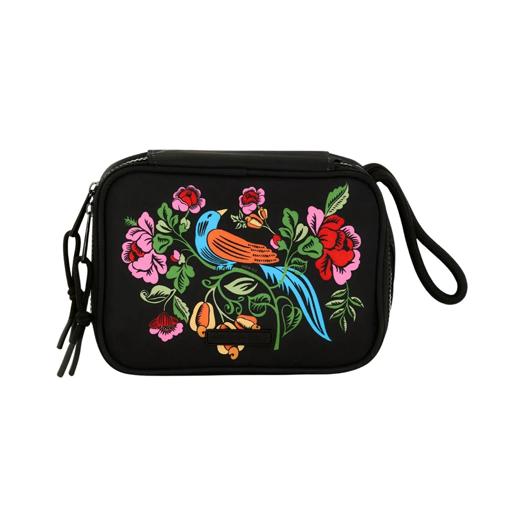 A Necessaire Farm Xerô Cashews And Birds possui tamanho médio, formato retangular, compartimento interno amplo com forro em tactel e bolso de fechamento em zíper, alça de mão em cordão na parte lateral, nome da marca emborrachada na parte frontal e fechamento superior em zíper.