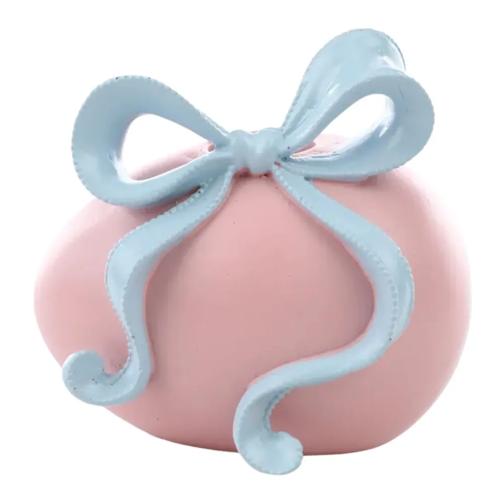 Seu design em formato de ovo simboliza renovação, vida nova e harmonia, enquanto o laço traz um toque romântico e decorativo. Perfeito para decorar mesas, aparadores, bandejas e cantinhos especiais.
